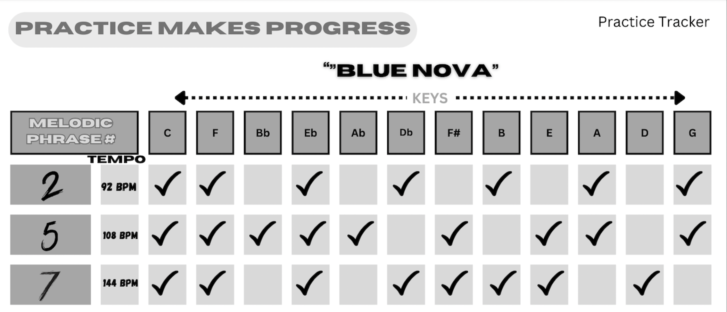 It's not always about how much time you spend practicing, but how you spend your time practicing. Use the Practice Tracker worksheets to make sure you are on track, organize your practice sessions, and help meet your goals. Each worksheet contains a well organized breakdown of the melodic phrases and vocabulary specific to each etude so you know what you have practiced, how many times, and when you practiced. Keeping organized and efficient is so important to getting the most from your practice sessions and achieving results!
